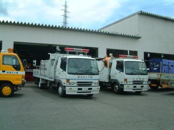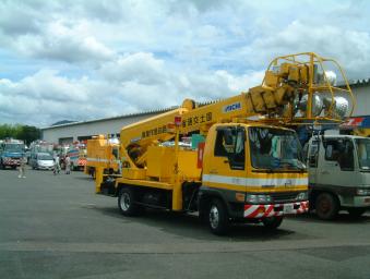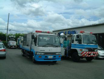 ● 復旧作業の支援で集まった国土交通省が保有する「排水ポンプ車」「照明車」「対策本部車」などの災害対策用車両