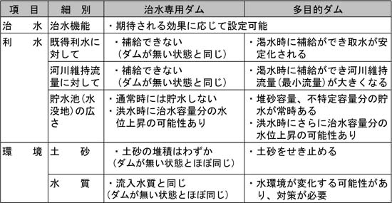 → 治水専用ダムの治水効果は、洪水吐がダム中間の高さにある従来のゲートの無い自然調節方式のダムと同じとなる。洪水吐が下にあると水が貯まらないため、土砂や水質に対する影響は格段に小さくなると考えられる。