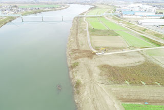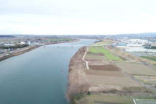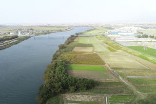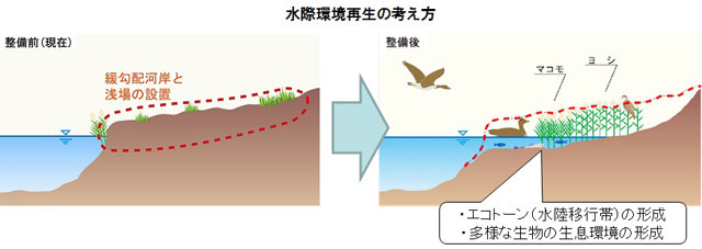 河岸の直立化に伴う浅場の減少により、抽水植物群落が減少しているため、陸域から水域にかけて河岸の緩勾配化を行い、抽水植物群落の拡大、エコトーンの形成・創出を行っております。