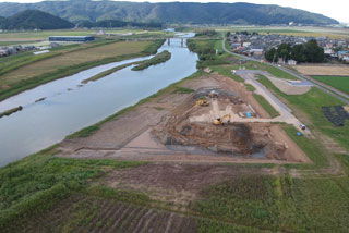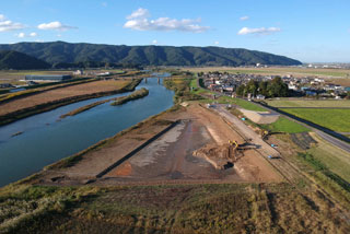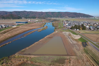 日野川上流部で流下能力不足を解消するための河道掘削を実施しております。河道掘削に併せて、多様な生物の生息・生育の場にも寄与する湿地等の創出も行っております。