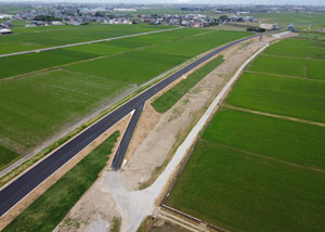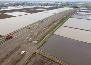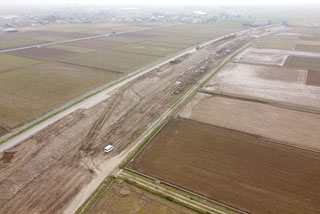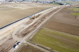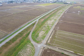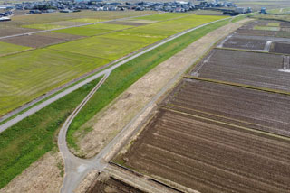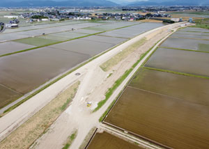 多くの区間で堤防断面が不足している九頭竜川・日野川の堤防整備を、河道掘削で発生する大量の土砂を有効活用し、堤防整備を進めています。