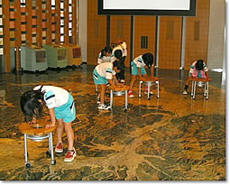縮尺5万分の1の地図がカートに乗せてあります。床面の航空写真と見比べてみよう!