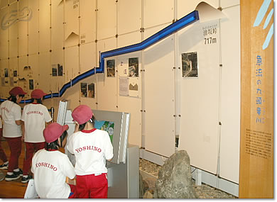九頭竜川の上流から下流までの高低差や周辺の山々がわかるように壁面に展示しています。