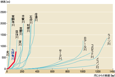 長さが短く、流れが急な日本の川は、ゆるやかに流れるアメリカやヨーロッパの川に比べると、まるで滝のようです。 日本で一番長い信濃川でも、長さがライン川の約10分の1で、流域面積は約76分の1です。このため日本の川は大雨が降るとすぐ水かさが増して洪水になり、晴れの日が続くとたちまち水が減ってひからびてしまいます。