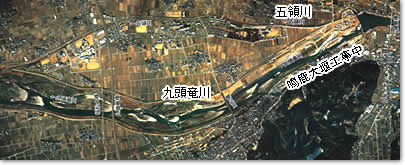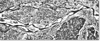 鳴鹿から下流の五領ヶ島あたりは、昭和43年(1968)まで河道が2つに分かれ、流路も大きく蛇行していました。現在は、旧五領川が細くなり河道跡には大学や病院などが建っています。