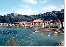 九頭竜川鳴鹿大堰は、九頭竜川河口から約29.4kmの所に位置しています。左岸は永平寺町法寺岡、右岸は丸岡町東二ツ屋です。
