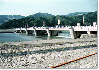 | 放流設備 | 主ゲート4門(高さ5.7m、幅43.35m) 土砂吐ゲート2門(高さ5.7m、幅16.85m) 左右岸に階段式魚道、人工河川式魚道、呼び水水路(微調節ゲート)各1条 |