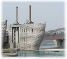A 管理橋の真ん中(ブロックでない所)に切れ目があるのは、予備ゲートを設置・撤去するための開口部分です。
