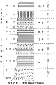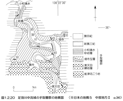 九頭竜川流域に分布する中生層としては、九頭竜川の中・上流域に広くみられる手取層群および各所に分布する足羽層群があげられる。