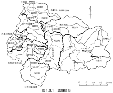こうした流域の地域社会の実態とその変遷をとりまとめるにあたっては、岐阜県郡上郡白鳥町石徹白地域を除外して整理を行った。そこで、対象とする九頭竜川流域の市町村は、表1.3.1に示す5市16町3村とし、図1.3.1に示す市町村を単位とする小流域区分で概観する。なお、小流域区分を市町村単位としているのは、流域界が市町村境界と相似していること、従前からこの分割方法が採用されていること、土地や都市の形態の比較が明確に行えることなどによる。