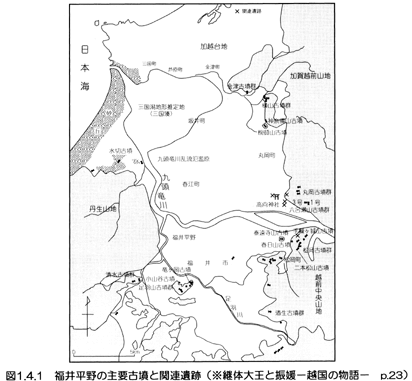 足羽川沿いの福井市足羽山上に築かれた足羽山古墳群は、前方後円墳1基と円墳32基からなり、4世紀後葉から5世紀後葉にかけて造営されたもので、三角縁神獣鏡・貝釧・碧玉製品など畿内色の濃い遺物を出土している。