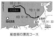 その後、船体は2つに折れ、船首部分が重油を流出しながら時速約2kmの速度で南東に漂流し、潮流と強い季節風の影響によって5日後の7日午後に、沈没現場から250km離れた三国町安島の雄島付近に漂着し、同町崎の沖合約150mに座礁した。残る船体は、隠岐島の北北東約113km地点に、重油約1万5千キロリットルを積んだ状態で沈没した。