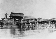 困り果てている勘助を見た母親が、「自分にはかねて用意した石棺がある。その中へ入るので、その石棺を台にして柱を建てれば、寸法の不足を補うことができる。私は人柱となって橋を守ろう。」といって、石棺の中に入った。この人柱は、水際から西南の2本目の柱であったという。
