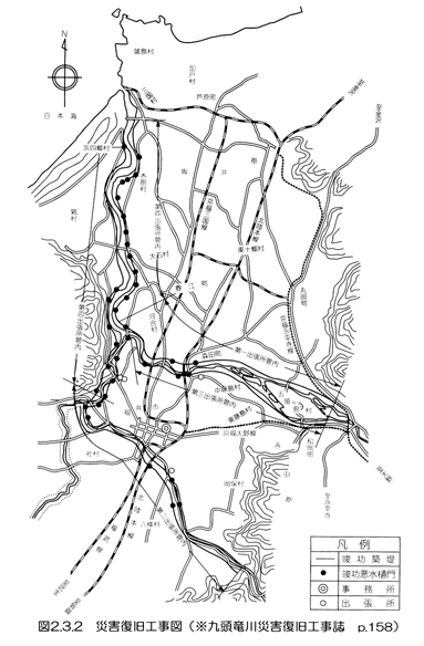 地震および洪水によって九頭竜川、日野川、足羽川の堤防・護岸および樋門・樋管などの河川施設は、壊滅的な状態となった。この災害復旧工事は、大震災の直後の7月に福井県当局により実施され始めたが、莫大な事業量であり、福井県独自の力では完遂することは不可能であるとして、8月1日をもって近畿地方建設局の委託工事に移され、ついで11月16日以降において直轄災害工事に切り変えられた。
