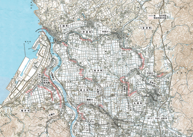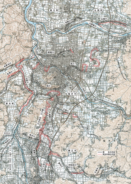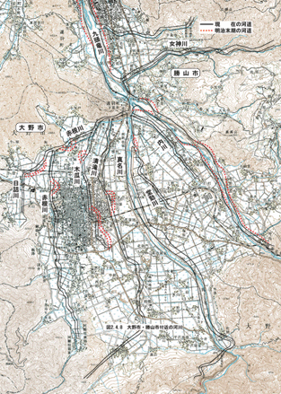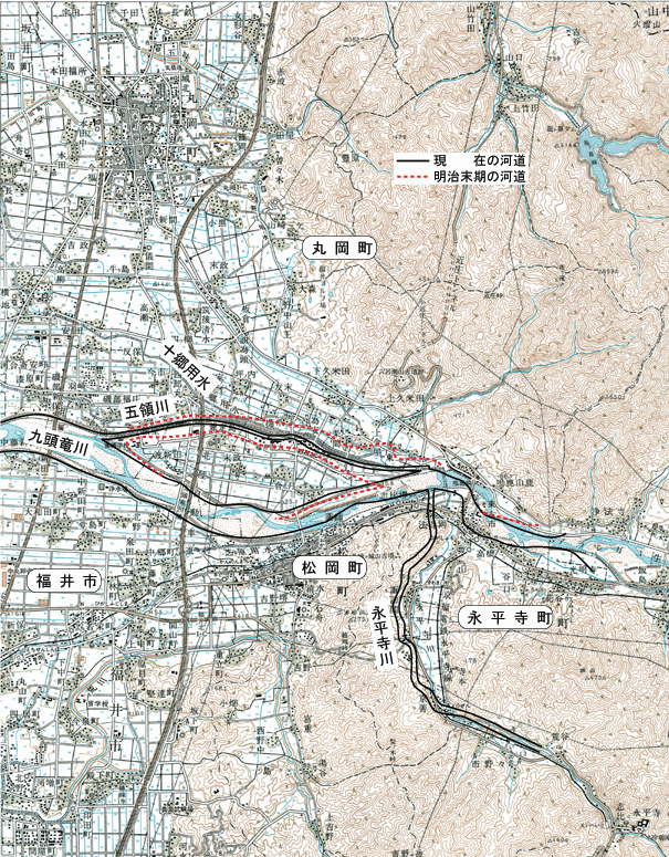 九頭竜川流域において近代的技術で地図が作製されたのは、明治43年(1910)に陸地測量部の2万分の1である。これと最近の地図を用いて、グラビアページの九頭竜・日野・足羽川改修計画図と九頭竜川改修・日野川筋計画図ならびに図2.2.5を明治末期の地図から読み取り、河道の変遷を作成して図2.4.5~2.4.8に示す。