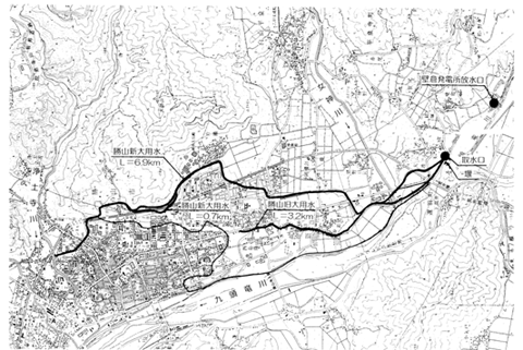 勝山大用水は、立合用水とも呼ばれ、大渡村(旧平泉寺村)で九頭竜川から取水して、若猪野村・上高島村・北市村・下毛屋村・下高島村・畦川村の6ヵ村および勝山町が共同利用していた用水で、江戸時代の享保初年(1720年頃)に造られた。用水の主目的は灌漑用水であったが、町方では飲料や防火用水などに利用していた。ところが、大渡村の取水口から勝山町まで距離が長く、漏水量が多く用水路の維持とともに、渇水のときの水量維持に困難を極めた。また、九頭竜川の洪水の都度、取水口が破損するなど、維持に要する出費が大きかった。必要経費は、一般には町方で2/3、6ヵ村で1/3を負担していたようである。