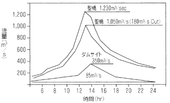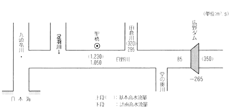広野ダム地点における流出量350m3/sのうち265m3/sをカットし、河川改修計画の基準点である聖橋地点の超過確率1/70年での基本高水流量1,230m3/sに対して、計画高水流量を1,050m3/sとする。