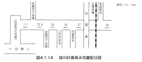 その後、宅地開発および都市下水路の整備が進み、下流部と中・上流部とで治水安全度が大きく差異が生じてきたため、整備水準を同一とすることを前提として、中小河川の当面の目標である1時間50mm(超過確率1/12年に相当)の降雨による出水にも耐え得る河道となるよう改修を進めることとなった。全体計画は、図4.1.14のとおりである。
