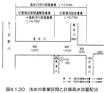浅水川は、平成10年(1998)7月10日の集中豪雨で越水するとともに、川沿いの各地で浸水被害が発生した。そこで、浅水川下流部を平成11年(1999)度より、災害復旧助成事業、河川災害復旧等関連緊急事業・基幹河川改修事業で改修することとなった。