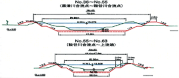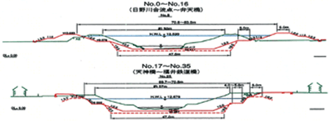 その後、昭和25年(1950)頃から流下能力を増大させるための河川改修が行われ、昭和37年(1962)、46年(1971)に計画規模を改定しつつ改修が進められた。その結果、日野川合流点付近の疎通能力は420m3/sとなった。