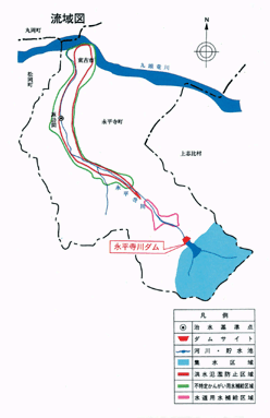 永平寺川ダムは洪水調節、流水の正常な機能の維持および永平寺町への水道用水の供給を目的として、平成3年度に着工した多目的ダム(小規模生活ダム)である。
