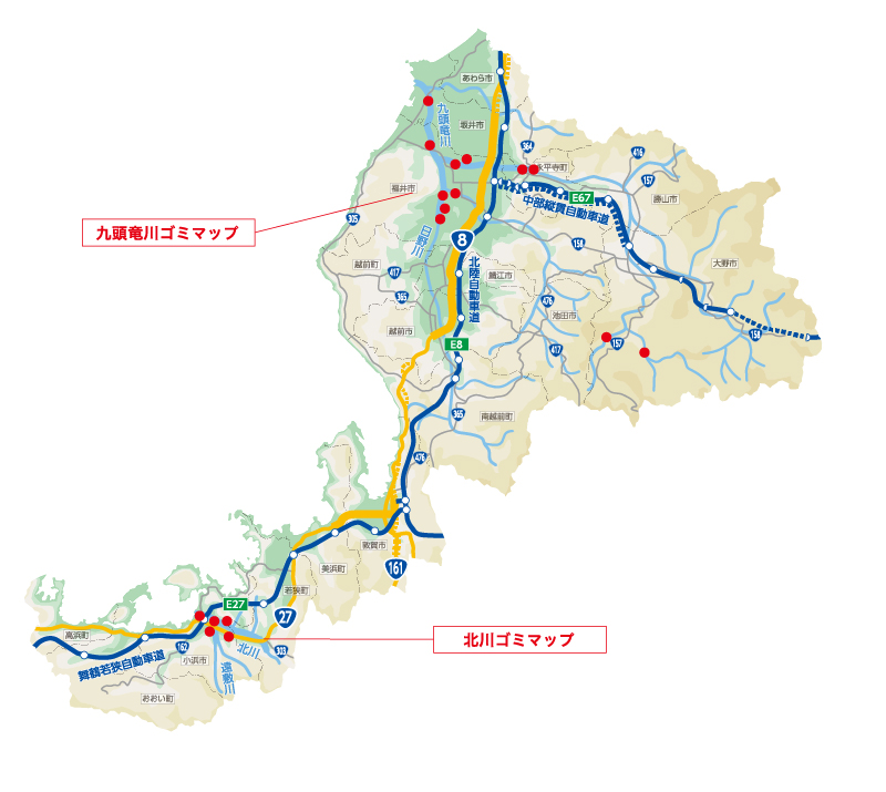 「ゴミは持ち帰りましょう」「ゴミ捨て禁止」 こんな当たり前の事が書かれた看板が堤防の至る所にあります。 九頭竜川は北陸・近畿を代表する鮎釣りの本場であり、北川は近畿で最も水質がきれいな川です。 福井河川国道事務所では日々パトロールをし、河川の異常などを監視しています。 これまでに多くのゴミ等が捨てられており、これらのゴミ処理には、多額の費用がかかるため、限られた予算内では全て処理できないのが現状です。また、処理にかかる費用は皆様の税金で処理をしています。