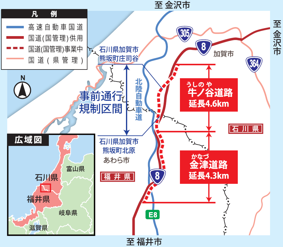 そのため、令和元年度より冬期の交通機能の確保、事前通行規制区間(連続雨量180mm)の回避、災害に強く信頼性の高い道路ネットワークの構築を目的に「牛ノ谷道路(石川県加賀市熊坂町~福井県あわら市牛ノ谷:4.6km)」及び「金津道路(あわら市牛ノ谷~あわら市笹岡:4.3km)」として事業を進めています。