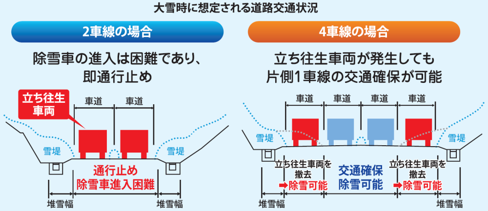4車線整備により、除雪車の進入が可能となり、立ち往生車両の発生による交通障害の早期解消が期待されます。