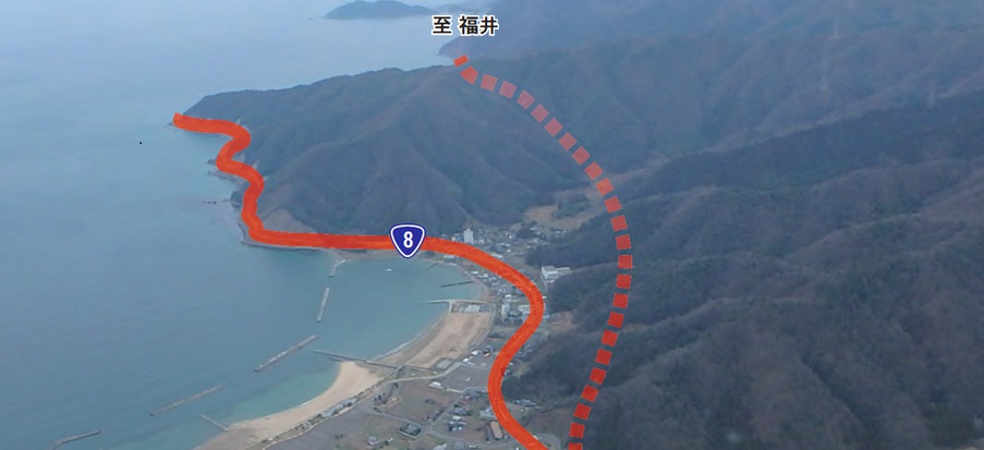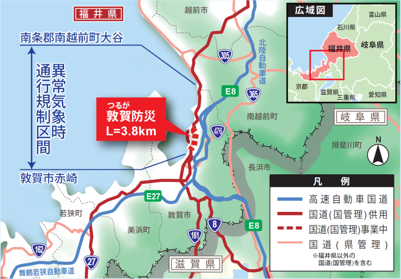 このうち、国道8号の福井県越前市から福井県敦賀市間は、急峻な地形であるため、道路幅員が狭く、急カーブや急勾配が続く区間です。特に冬期には、多量の降雪・積雪及び厳冬による路面凍結のため、通行止めや交通渋滞が発生し、円滑な交通の妨げとなっています。また、福井県南越前町大谷~福井県敦賀市赤崎間(10.7km)は、異常気象時における通行規制区間となっています。