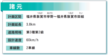 そのため、平成30年度より、敦賀市挙野~敦賀市田結間(3.8km)について、「敦賀防災」事業として着手し、災害時の代替性の確保、安全で快適な走行の確保、積雪時の円滑な交通の確保を目的に、早期の整備を進めています。このうち、国道8号の福井県越前市から福井県敦賀市間は、急峻な地形であるため、道路幅員が狭く、急カーブや急勾配が続く区間です。特に冬期には、多量の降雪・積雪及び厳冬による路面凍結のため、通行止めや交通渋滞が発生し、円滑な交通の妨げとなっています。また、福井県南越前町大谷~福井県敦賀市赤崎間(10.7km)は、異常気象時における通行規制区間となっています。