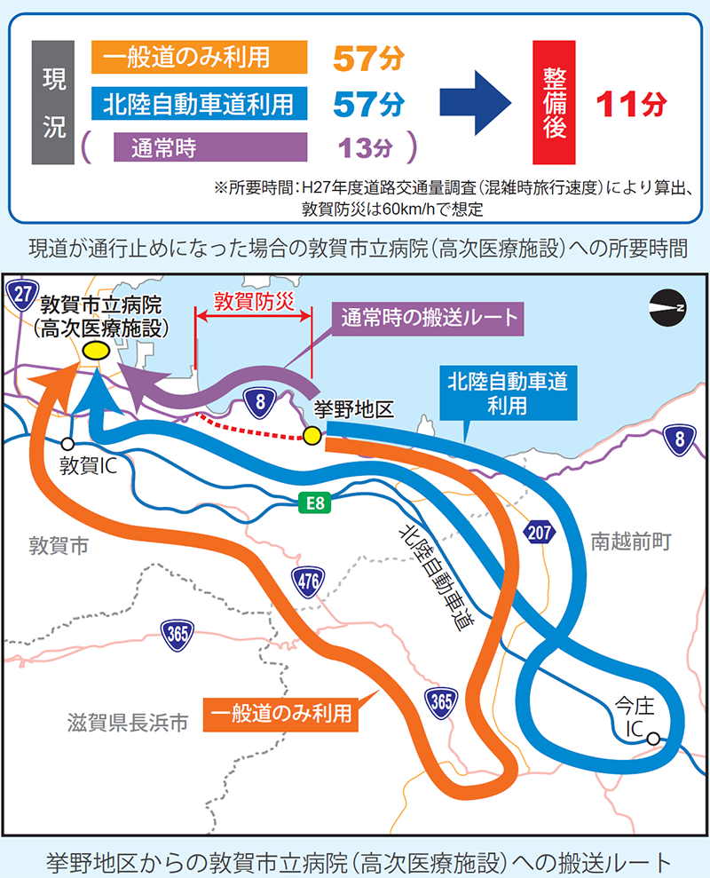 挙野地区から敦賀市立病院(高次医療施設)までの所要時間は、現道が通行止めになった場合、迂回ルートを使うと約57分かかってしまいますが、整備後は約11分になります。