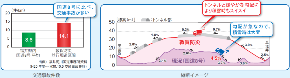 敦賀防災の整備により、災害時に代替ルートが確保でき、安定した交通が確保されます。