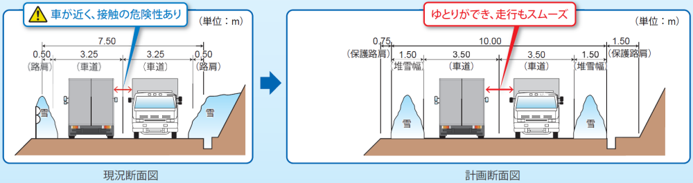 堆雪幅が確保されることで、積雪時の大型車の走行がスムーズになり、円滑な交通が確保されます。