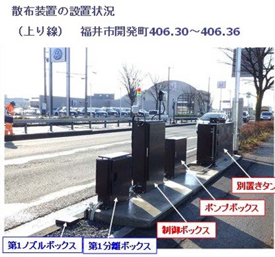 また、縦断勾配の大きい箇所やインターアクセス道路交差部に、凍結防止剤散布装置や消融雪設備を設置し、円滑な交通の確保に努めています。