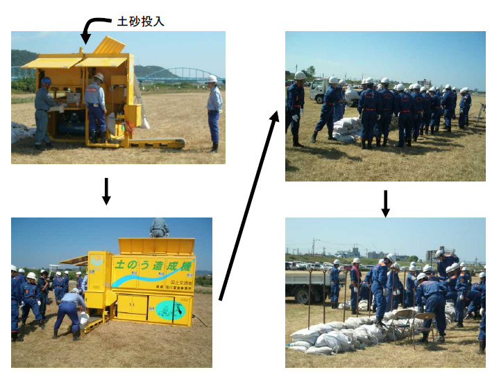 土のう造成機は、水防活動で使う土のうを短時間で大量につくる機械です。