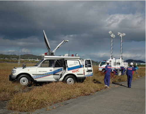 災害対策用機械として対策本部車、照明車、排水ポンプ車、衛星通信車、土のう造成機を保有し、災害時の出動に備えています。