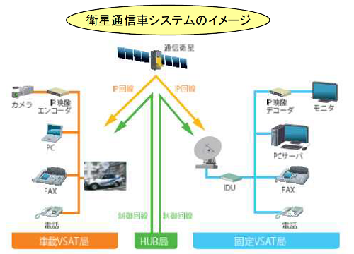 衛星通信車は、災害発生現場の映像や音声を通信衛星を利用して各関係機関に提供する車です。
