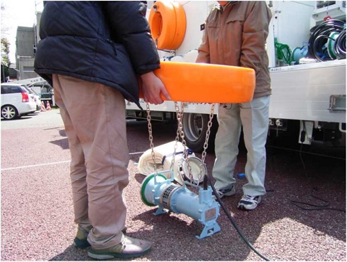 - 排水ポンプ車で使用している排水ポンプは、人で持てるようにするために軽量合金を使用しています。