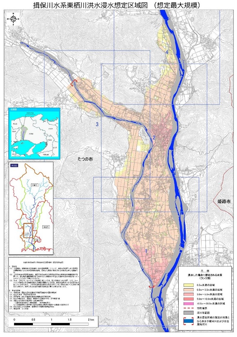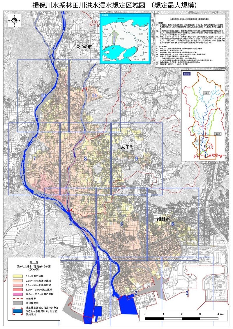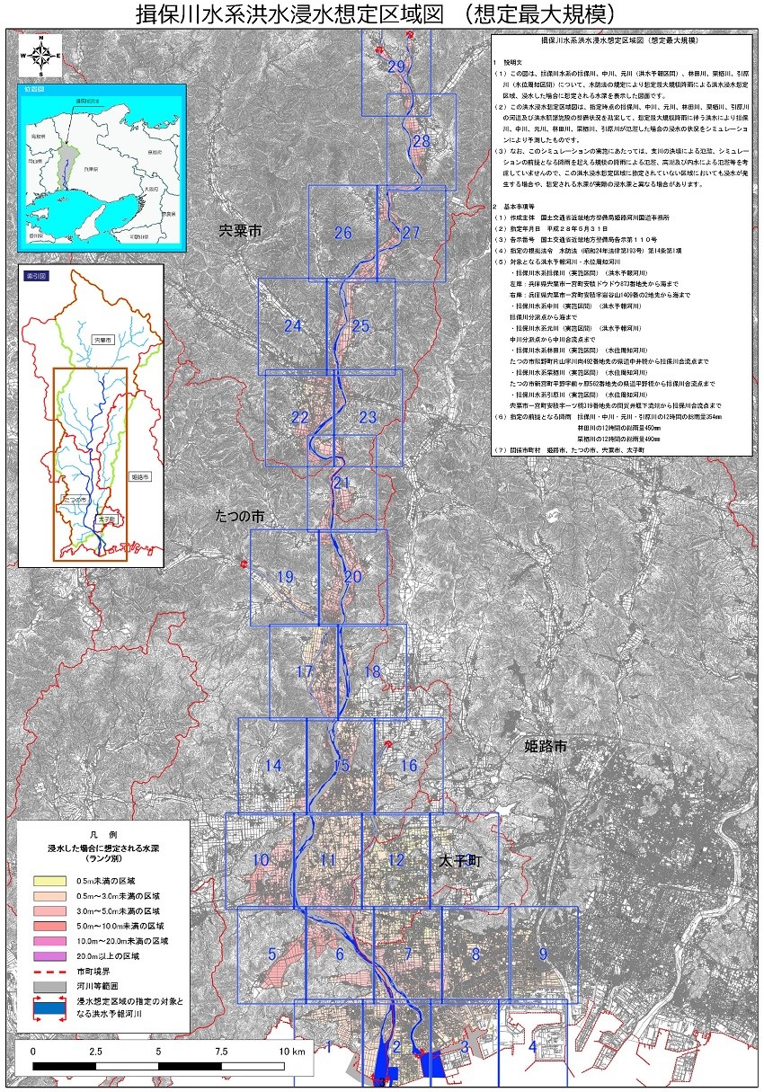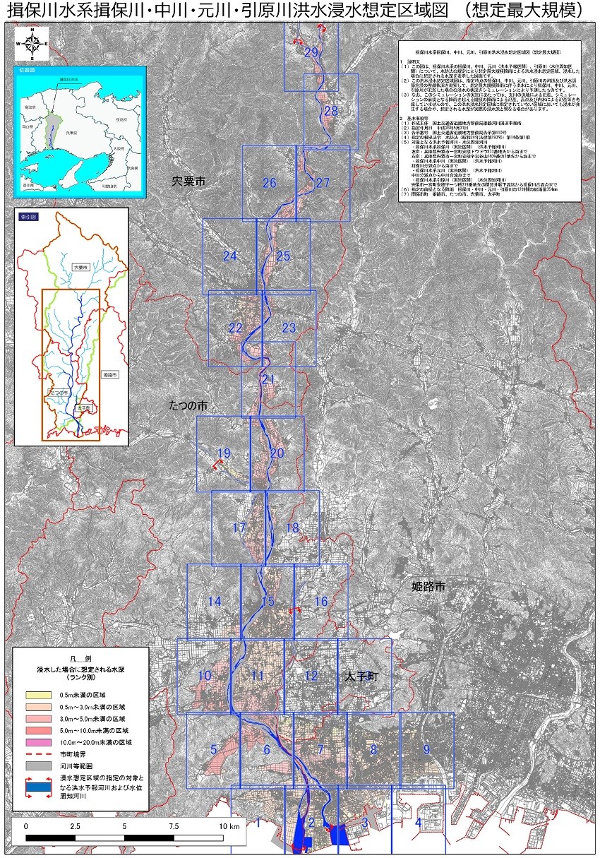 揖保川本川・支川全体版(想定最大規模 浸水想定区域図) 揖保川・中川・元川・引原川のみ(想定最大規模 浸水想定区域図) 林田川のみ(想定最大規模 浸水想定区域図) 栗栖川のみ(想定最大規模 浸水想定区域図) 想定最大規模 揖保川本川・支川全体版(想定最大規模 浸水想定区域図) 揖保川水系洪水浸水想定区域図(想定最大規模)1-29 揖保川・中川・元川・引原川のみ(想定最大規模 浸水想定区域図) 揖保川水系浸水想定区域図(想定最大規模) 1-29 林田川のみ(想定最大規模 浸水想定区域図) 揖保川水系林田川浸水想定区域図(想定最大規模) 1-11 栗栖川のみ(想定最大規模 浸水想定区域図) 揖保川水系栗栖川浸水想定区域図(想定最大規模) 1-4