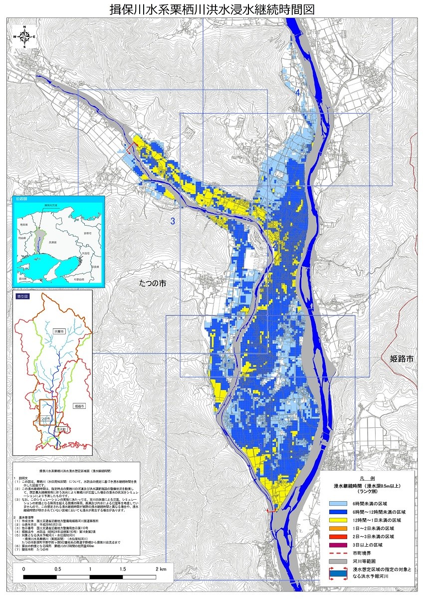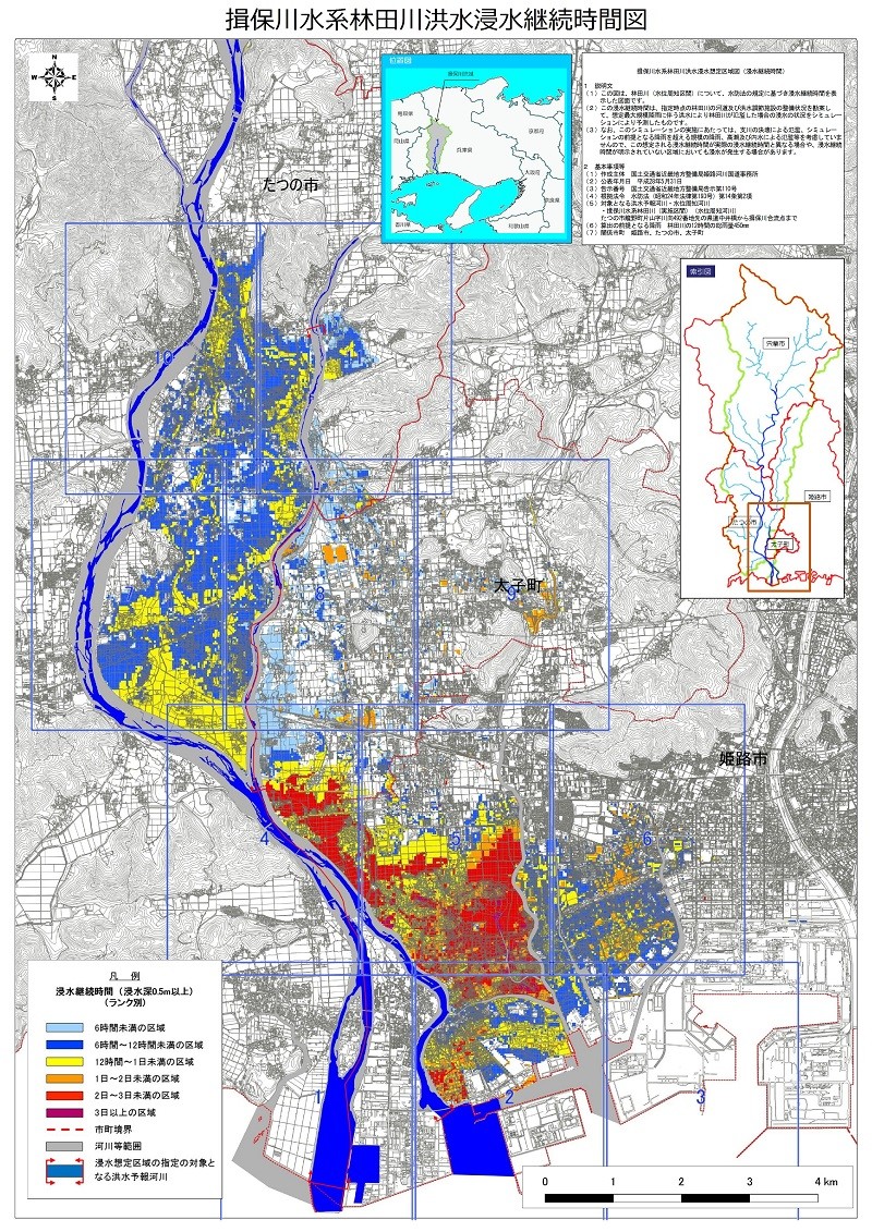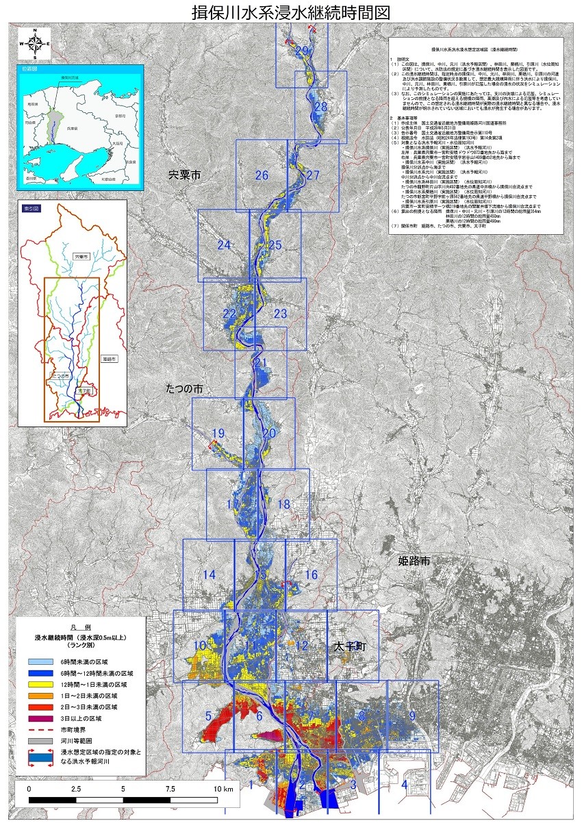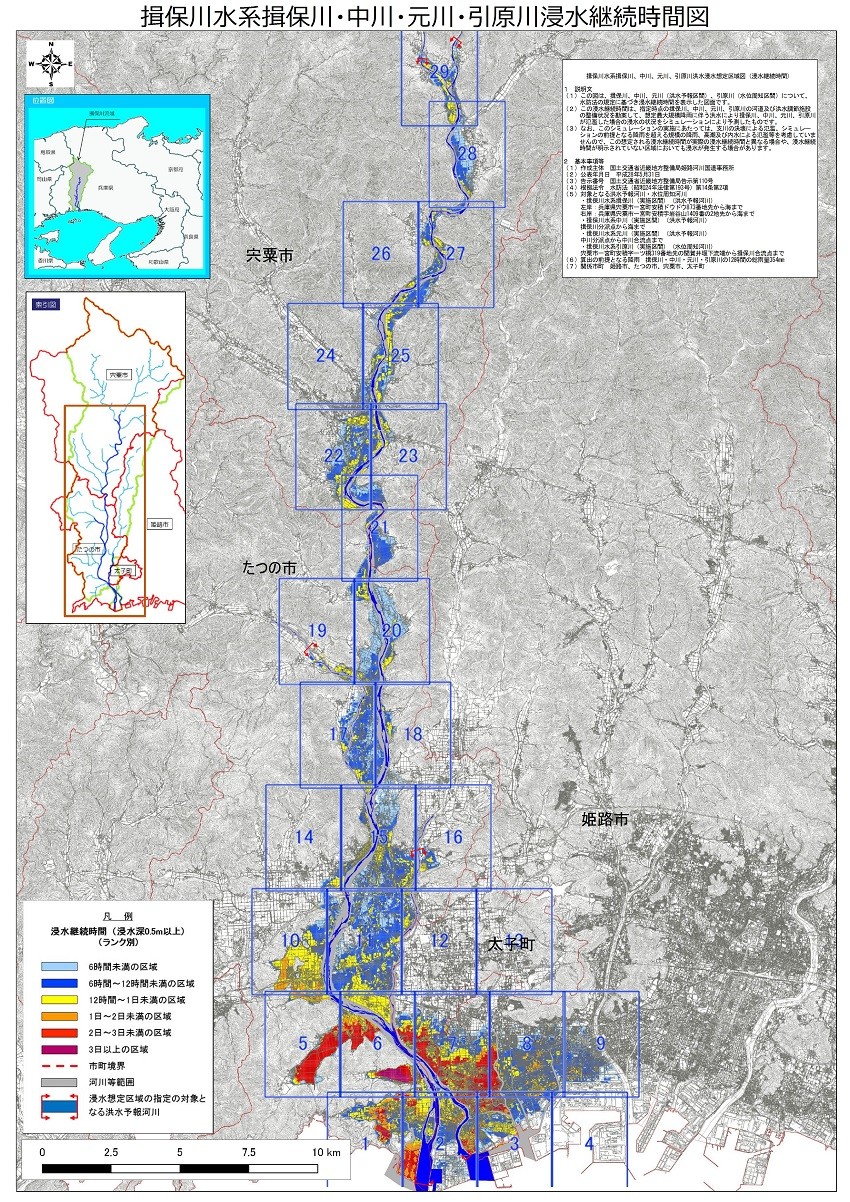浸水継続時間(最大規模降雨時) 揖保川本川・支川全体版(浸水継続時間) 揖保川水系浸水継続時間図 1-29 揖保川・中川・元川・引原川のみ(浸水継続時間) 揖保川水系揖保川・中川・元川・引原川浸水継続時間図 1-29 林田川のみ(浸水継続時間) 林田川洪水浸水継続時間図 1 栗栖川のみ(浸水継続時間) 栗栖川洪水浸水継続時間図 1-4
