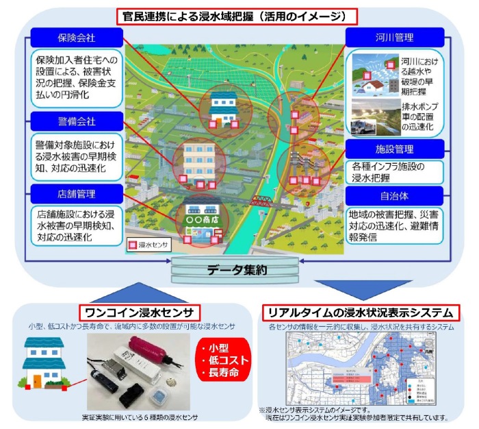 国土交通省では、浸水状況をいち早く把握し迅速な対応を行うため、R4年度より、浸水の危険性がある地域に国や自治体等がワンコイン浸水センサを設置して実証実験を実施しており、リアルタイムに浸水状況を収集・共有する仕組みの構築に向け、センサの特性や情報共有の有効性等を検証してきている。