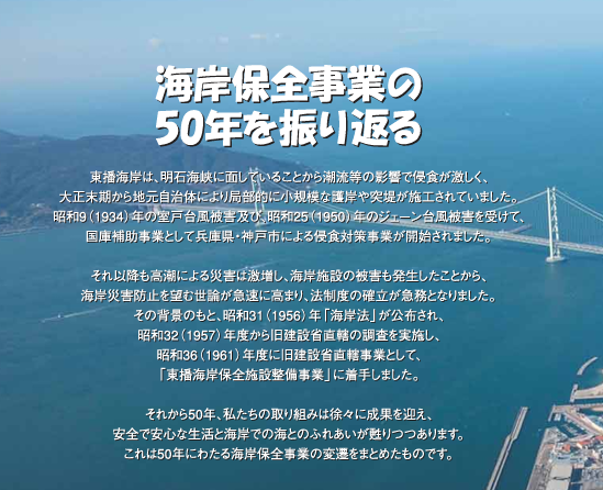 東播海岸の概要 東播海岸の概要 東播海岸の歴史 事業紹介 海岸保全施設整備事業 海岸事業調査 東播海岸(明石西外港地区)堤防完成式典 エコ・コースト事業 東播海岸冊子 H30年 台風対応の概要(東播海岸) 海岸法第8条の2第1項第3号の区域 東播海岸における船舶等の放置を禁止する区域の指定について 海岸管理の取り組み 安全点検 大蔵・舞子海岸の空洞対策検討委員会 東播海岸の管理に関する検討会 明日の東播海岸を考える懇談会