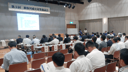 第5回 <令和元年 5月27日(月)> 配付資料 議事次第 第5回 揖保川減災対策協議会 名簿 資料1 頻発する豪雨災害を踏まえた河川のリスク 資料2–1 平成30年7月豪雨を受けた提言(内閣府) 資料2–2 平成30年7月豪雨を受けた提言(国土交通省) 資料3 危機管理型水位計の紹介と運用方針 資料4–1 姫路河川国道事務所の取組 資料4–2 気象庁の取組 資料4–3 各市町・県の取組内容 参考1 目標達成の具体的取組状況 参考2 揖保川減災対策協議会規約