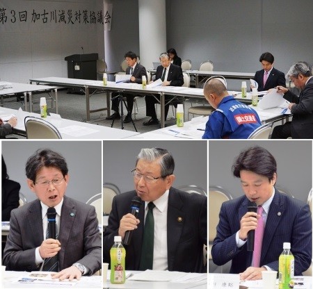 第3回 <平成29年 3月22日 (水)> 配付資料 議事次第 第3回 加古川減災対策協議会 名簿 資料1–1 社会資本整備審議会 河川分科会 答申概要 資料1–2 水防法改正の概要 資料1–3 平成29年度 予算制度の拡充について 資料2–1 目標を達成するための具体的な取組状況 資料2–2 事務所の取組内容 資料2–3 各市、県の取組内容 資料3–1 最大規模洪水が発生した際の避難について 資料3–2 タイムライン検討会について
