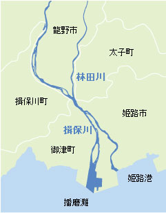 豊かな水の流れは、産業を興し、ものを運ぶ原動力となり、いつの時代も変わらぬ美しさで、多くの人に親しまれてきました。しかし、揖保川・林田川では、近代化の波が押し寄せると共に、水は汚れ、魚の姿もいつしか消えていきました。