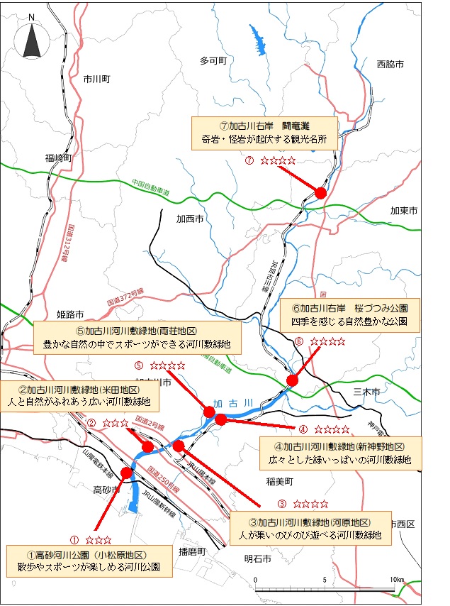加古川 ① 高砂河川公園(小松原地区) ②加古川河川敷緑地(米田地区) ③加古川河川敷緑地(河原地区) ④加古川河川敷緑地(新神野地区) ⑤加古川河川敷緑地(両荘地区) ⑥加古川右岸桜づつみ公園 ⑦加古川右岸闘竜灘