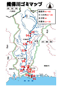 ゴミマップ 加古川・揖保川には多くのゴミが捨てられています。この現状を多くの方に知っていただくために、このゴミマップを作りました。 加古川・揖保川は流域の方々みんなの財産です。ゴミのない美しい加古川・揖保川にしましょう。 加古川 加古川ゴミマップ 加古川市 01~18 小野市 19 高砂市 20~22 揖保川 揖保川ゴミマップ 姫路市 01~02 たつの市 03~09 太子町 10 宍粟市 11~15