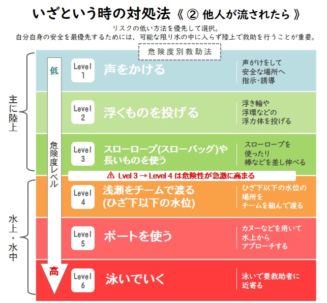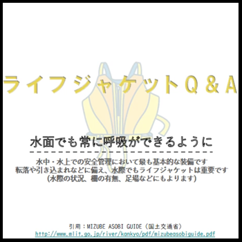 水辺の安全ハンドブック(引用:河川財団) ミズベアソビガイド(引用:国土交通省) 水難事故防止に役立つ情報をお届けいたします。 水辺の小わざ(引用:山口県土木建築部河川課) 水辺の安全ハンドブック(引用:河川財団) 水辺の安全ハンドブック(WEB用PDF) まずは川の特性を知ろう①【水がある】 まずは川の特性を知ろう②【流れがある】 注意するポイント①【水中・水上編1】 注意するポイント①【水中・水上編2】 注意するポイント②【水際編】 注意するポイント③【河川敷・堤防編】 場所と気象の情報 危険を知る① 危険を知る② 川の流れを見極める① 川の流れを見極める② いざという時の対処法① いざという時の対処法② その他の注意点 ミズベアソビガイド(引用:国土交通省) ミズベアソビガイド(WEB用PDF) 水がある 流れがある ライフジャケットQ&A 水際での注意点 水際Q&A 気象と場所の情報
