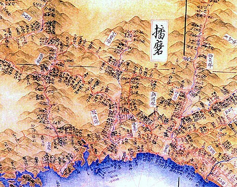 揖保川の舟運によって街道のルートが変わる 伊能忠敬が美作道および因幡道を測量する。ここで「正保国絵図」のコースに変更が加えられ、旧コースは古街道と記された。これは揖保川舟運の影響によって人や物の流れが変わったためだと考えられている。 ![]() <大日本沿海輿地全図> 年次:寛延二年/東京国立博物館蔵 |