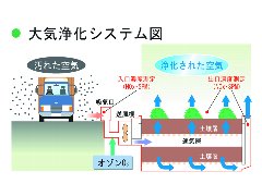 自動車排気ガスなどによって汚染された大気を吸気口から吸い込み、微量のオゾンを加えた後、土壌層に通気し、沿道の大気を浄化するシステムを使用した実験施設で、他に国道43号尼崎市西向島町にも設置しています。